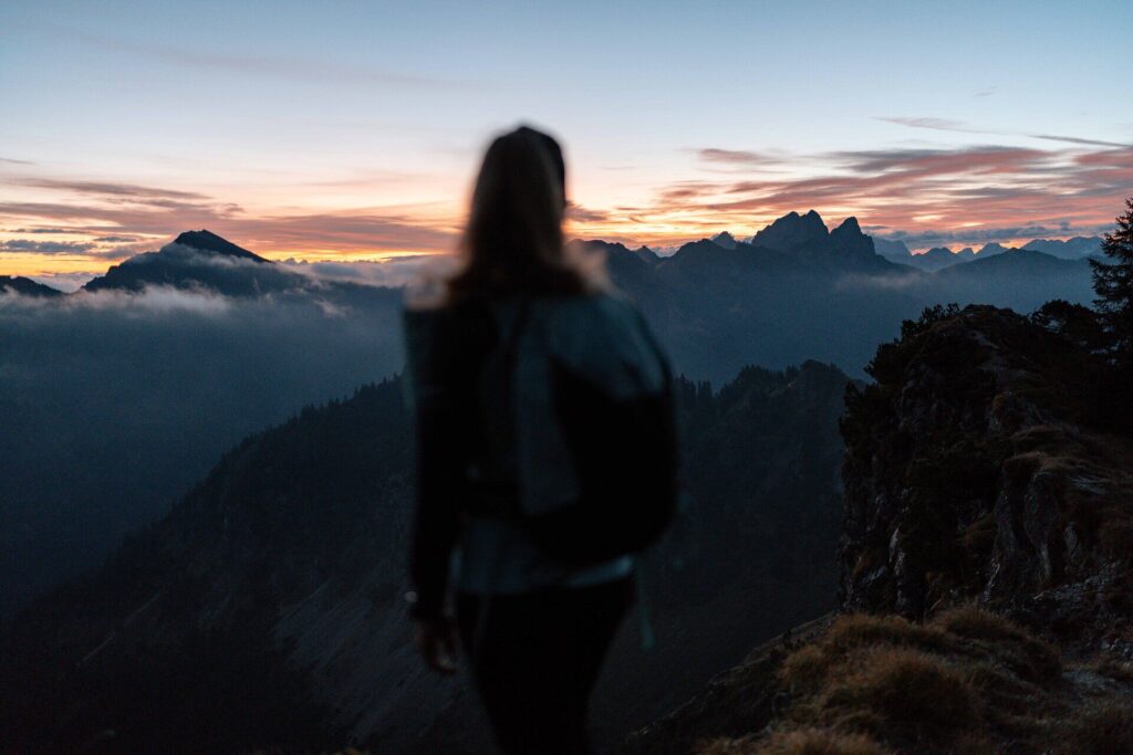 Je näher man dem Grat kommt, desto weiter öffnet sich der Blick auf das Tannheimer Tal und das Allgäu. „Wenn die Sonne dann hinter den Berggipfeln aufgeht, ist das richtig schön“, sagt Katharina. Die letzten Meter zum Gipfel erfordern Trittsicherheit beim Überqueren der Felsen, dann steht man oben und genießt das Panorama. 750 Höhenmeter, circa 2,5 Stunden Gehzeit, mittlere Schwierigkeit. Gerade für solche Sonnenaufgangs-Touren empfiehlt Katharina, eine Bergwanderführerin zu buchen, denn in der Dunkelheit sei es manchmal schwierig, den Weg zu finden.